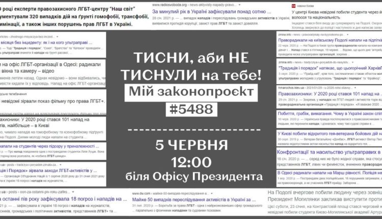 - Скорейшего принятия законопроекта # 5488 “О внесении изменений в Кодекс Украины об административных правонарушениях и Уголовный кодекс Украины относительно борьбы с проявлениями дискриминации“