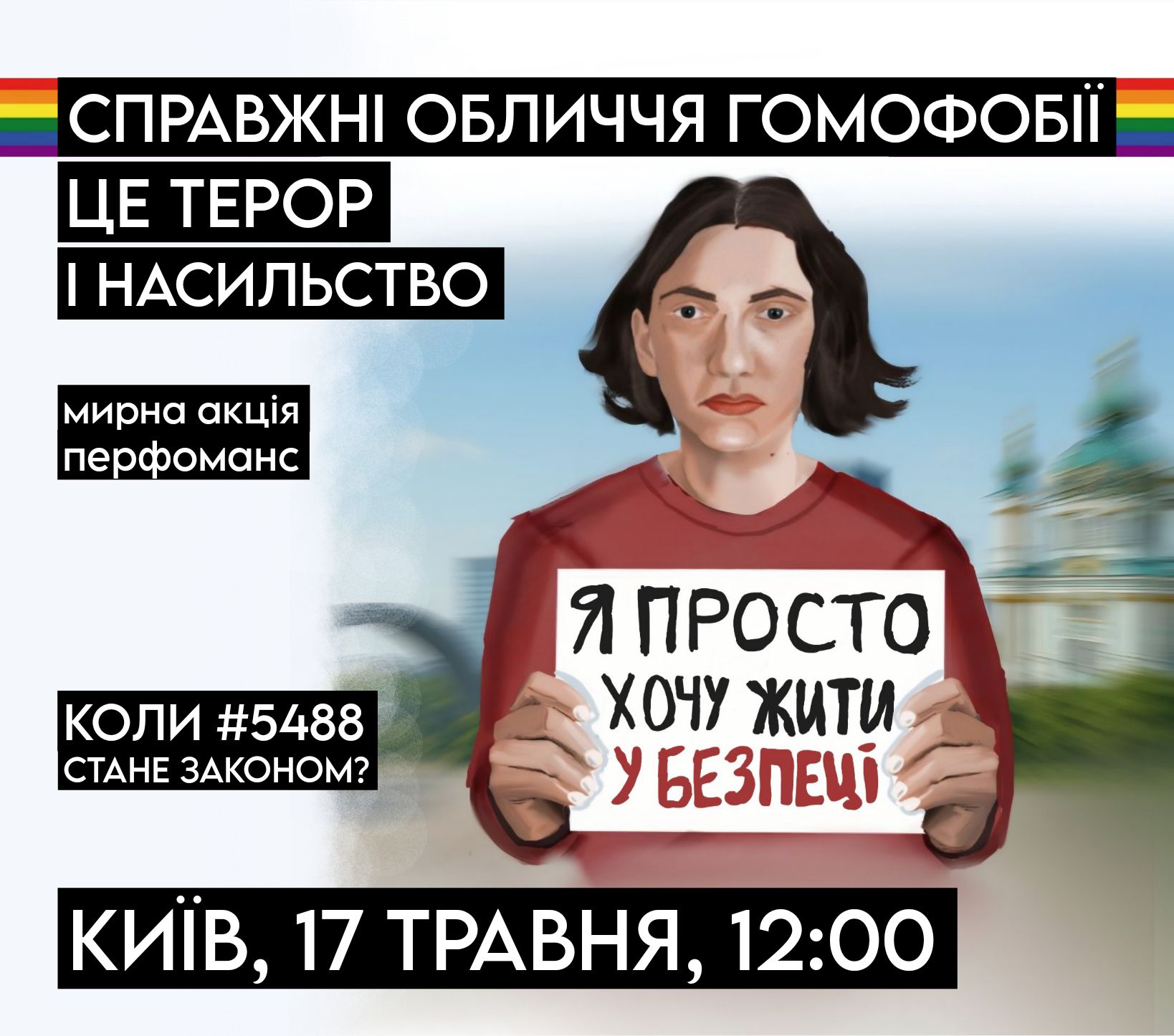 Ми виходимо на акцію 17 травня вдруге. Рік минув, а ніяких змін не відбулося. Я нагадаю, що законопроєкт 5488 був зареєстрований ще у 2021 році. Ще у 2021 році близько тисячі людей вийшли під Офіс Президента вимагати його негайного ухвалення. Бо проблема нападів на ЛҐБТІК+ в Україні актуальна вже давно і лишається такою досі. Чотири роки українська держава мовчить та чекає — чекає, поки кожного місяця десь побили хлопця біля входу до ґей-клуба, десь напали на дівчат за веселкові значки на рюкзаку, ще десь побили пару, яка гуляла містом… І таких історій багато.