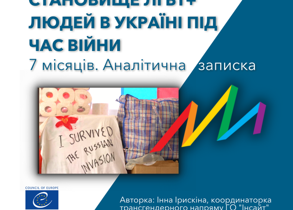 Аналітична записка «Становище ЛГБТ+Абревіатура: лесбійки, геї, бісексуальні, трансгендерні, інтерсекс, квір-люди та інші. людей в Україні під час війни» підготовлена Громадською організацією «Інсайт» у межах проєкту «Невідкладна підтримка для подолання дискримінації ЛГБТ+Абревіатура: лесбійки, геї, бісексуальні, трансгендерні, інтерсекс, квір-люди та інші. спільноти в Україні», що реалізується за підтримки Офісу Ради Європи в Україні.