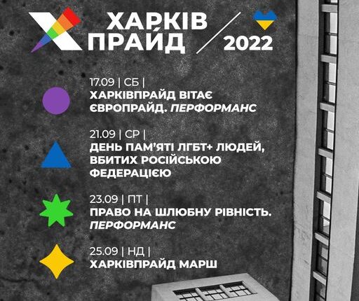 ХарківПрайд – не лише марш, це цілий тиждень прайд-подій присвячений актуальним темам ЛГБТ+ спільноти Харківщини, та всієї України. Цього року заходи відбуватимуться з 17 до 25 вересня за попередньою реєстрацією, тож зберігайте програму, щоб не проґавити і бути в курсі усіх подій.