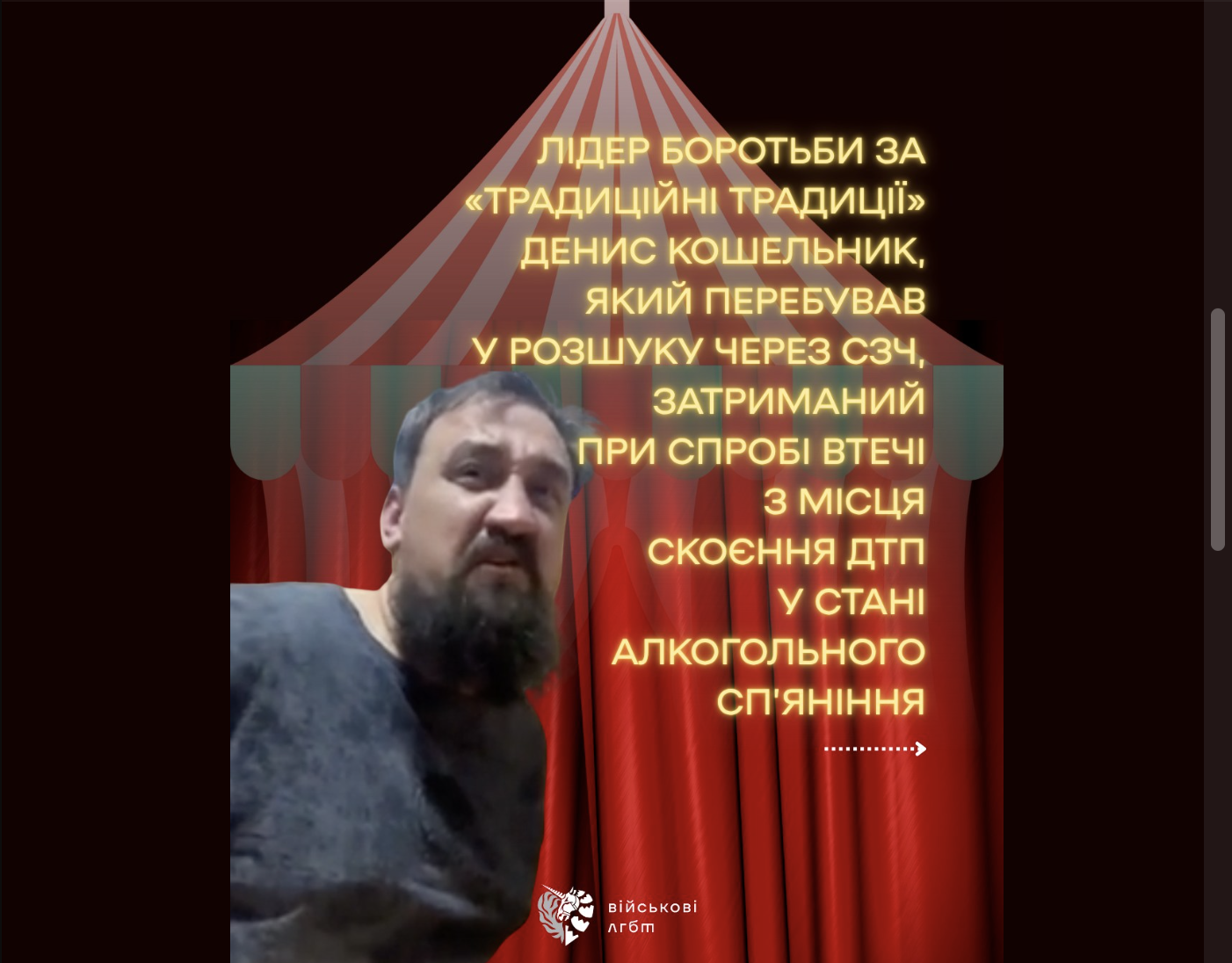 «Поки відкриті ЛҐБТІК+ військові щодня ризикують життям на передовій, цей лицемір переховується у тилу, п’є та всіляко ухиляється від служби», — зазначає ГО в заяві.