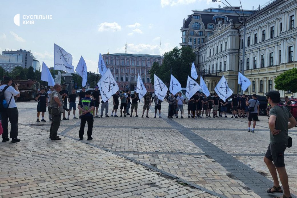 Біля площі також зібралися представники правої молоді з прапорами “Щит традиції”. Вони вигукують гасла, зокрема: “Традиція, сім’я, порядок”. На місці події чергують поліцейські.
