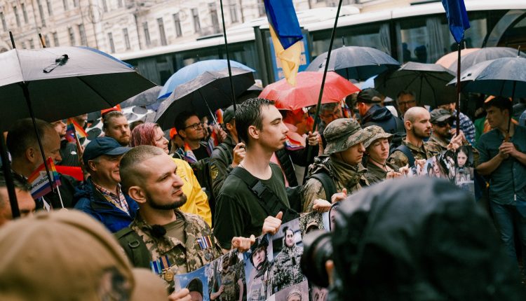 Близько тридцяти представників ЛГБТ+ військових, ветеранів та їхніх союзників вимагали рівних прав на ході КиївПрайд