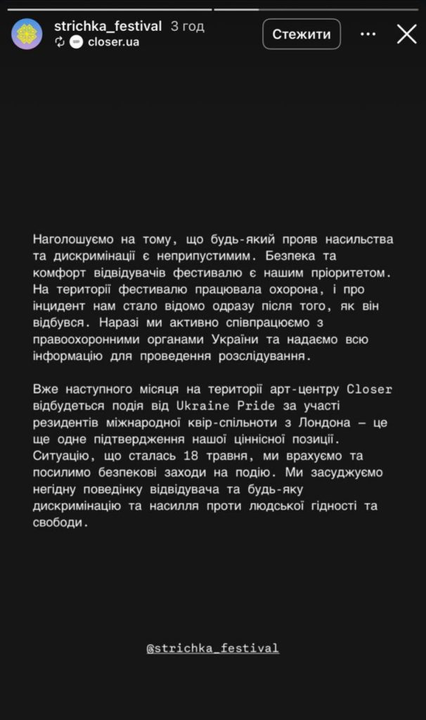 “Це ще одне підтвердження нашої ціннісної позиції. Ситуацію, що сталась 18 травня, ми врахуємо та посилимо безпекові заходи на подію”, – йдеться в сторис.