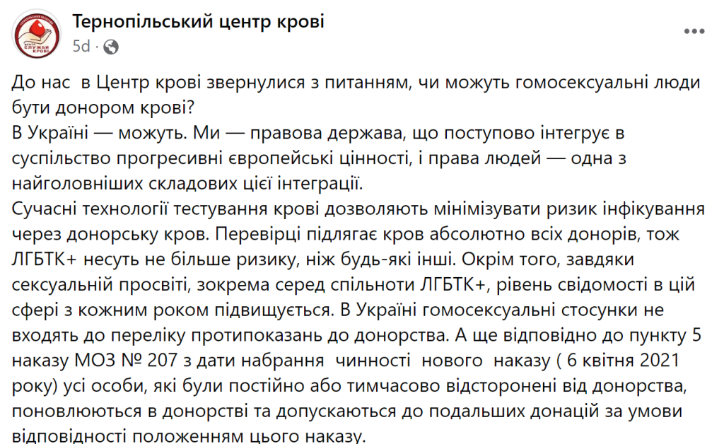 Проте зараз представники ЛГБТ-спільноти вільно можуть бути донорами. Тернопільський обласний центр служби крові на своїй сторінці у фейсбуці також повідомлення про заборону донорства через гомосексуальні стосунки.
