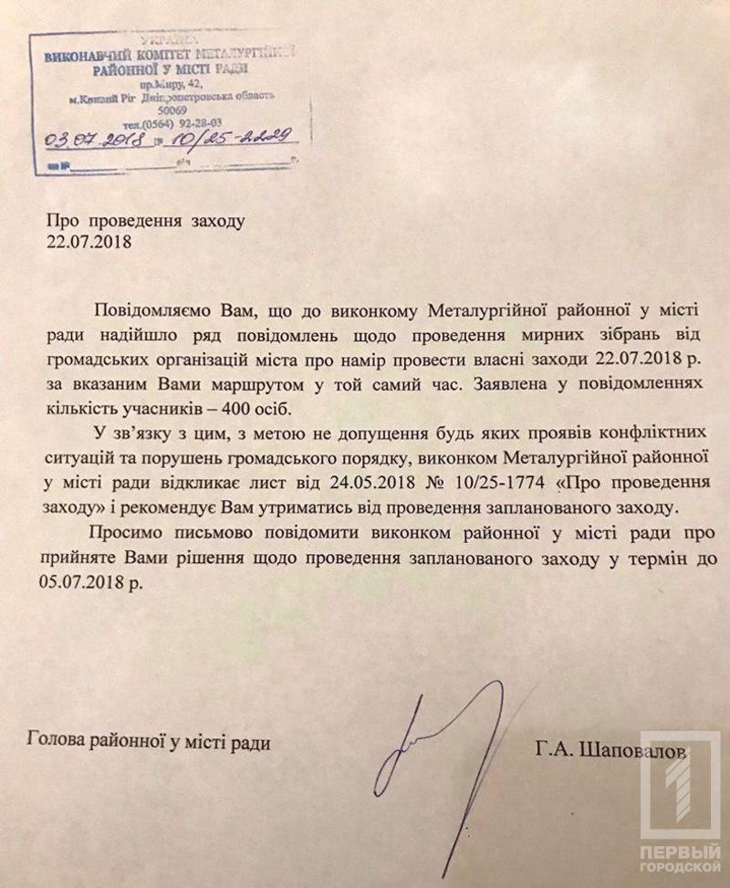 Причиной просьбы Геннадия Шаповалов об отмене проведения марша стало то, что именно в день «КривбассПрайда», 22 июля, другие патриотически настроенные общественные организации решили провести свои акции. Чтобы избежать конфликта, Металлургический исполком просил всех организаторов пойти на уступки и отменить запланированное.