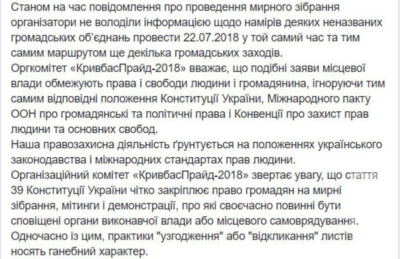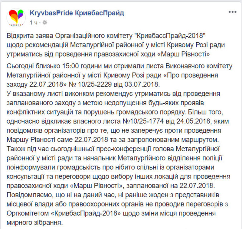 О том, что участники ЛГБТ-сообщества собираются перенести марш равенства, организаторы сообщили в соцсети. 3 июля в оргкомитет «КривбассПрайд – 2018» пришло обращение от имени главы Металлургического райсовета Геннадия Шаповалова. В письме он рекомендовал отменить проведение запланированного шествия. Оргкомитет марша равенства на своей станице в Фейсбук заявляет, что готов идти на компромисс.