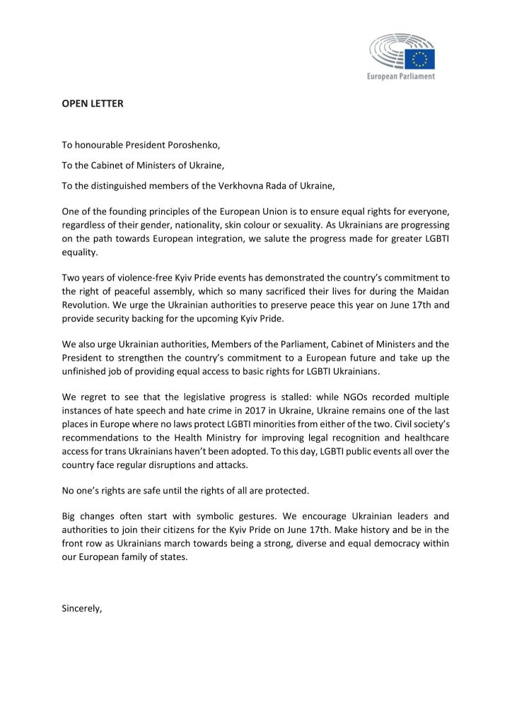 Это первое в истории коллективное письмо от представителей Европейского парламента в поддержку КиевПрайд и равных прав для ЛГБТ в Украине.