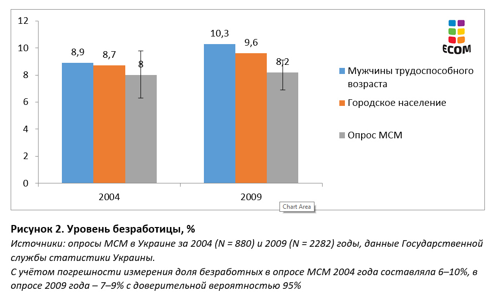 Видно, что безработица среди обследованных МСМ не была существенно выше, чем среди трудоспособных мужчин или городских жителей. Причём в 2009 году уровень безработицы среди МСМ не превышал данные Госстата даже с учётом погрешности оценки.