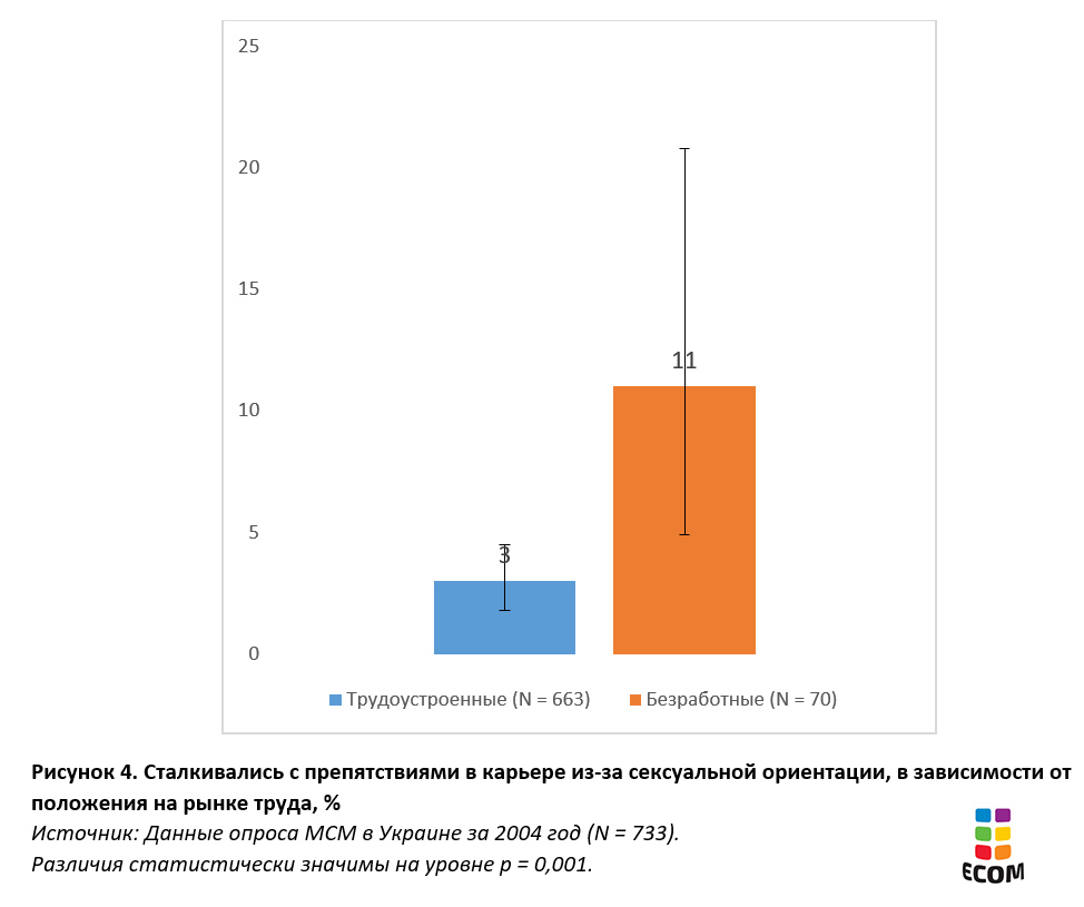 Дискриминация на работе из-за сексуальной ориентации, конечно, случается регулярно, но похоже, это не самая частая проблема для МСМ в Украине. Кроме того, непохоже, что безработица среди МСМ выше общенациональных показателей.