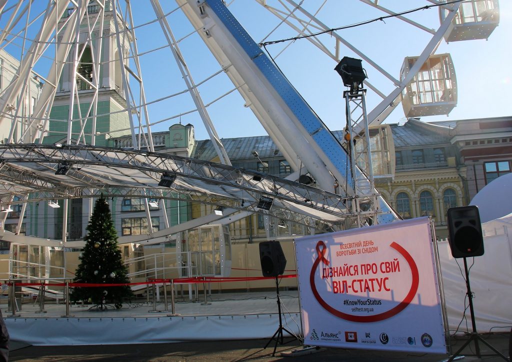 30 ноября, накануне Всемирного дня борьбы со СПИДом, в Киеве состоялось сразу несколько акций по тестированию на ВИЧ. С самого утра на Печерске возле монумента по ВИЧ/СПИДу провели акцию «Не будь ребенком. Пройди тест на ВИЧ», а на Контрактовой площади возле колеса обозрения тестировали и консультировали всех желающих в рамках мероприятия с романтичным названием «Тест под небесами».