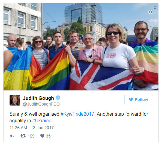 В качестве цитаты приводился твит британского посла в Украине Джудит Гоф, которая тоже участвовала в Марше равенства. Кстати, посол Гоф — открытая лесбиянка.