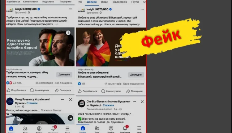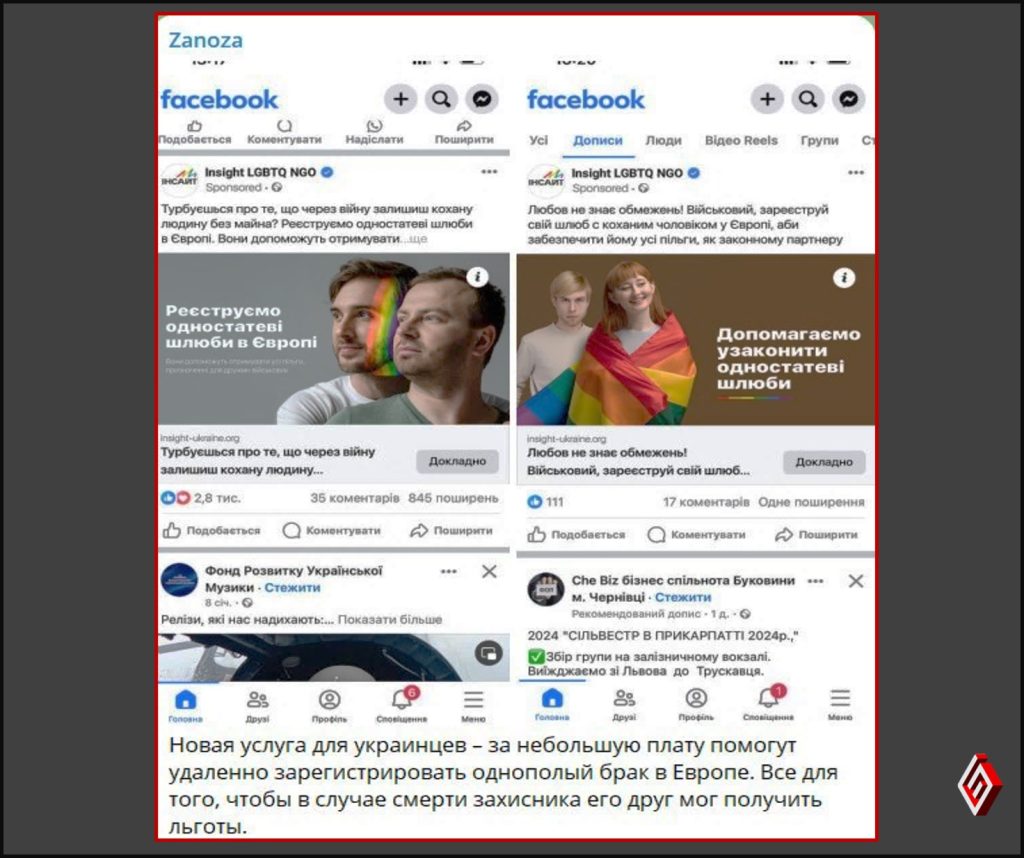 Цей вкид поширили активно російські телеграм-сміттярки. Проте, для ілюстрації були використані нібито скріншоти з мережі Фейсбук. У нібито дописі у цій мережі повідомляється, що нібито українська організація Insight LGBTQ NGO відкрила нову послугу для українських військових – реєстрації одностатевих шлюбів у Європі. Мета – буцімто у разі загибелі одного із учасників шлюбую, інший може претендувати на майно та пільги першого.