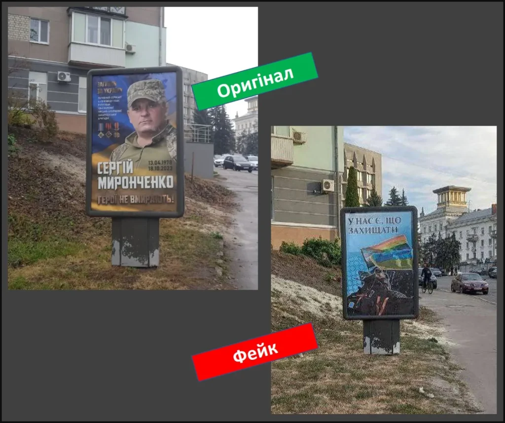 У Сумах немає сіті-лайтів із військовим та прапором ЛГБТ. Рекламний лайтбокс підробили пропагандисти у фоторедакторі.