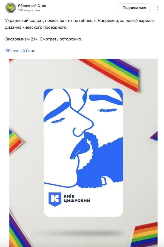 Російські ЗМІ та користувачі в соцмережах заявляють, що у Києві презентували новий дизайн проїзного для громадського транспорту, на якому зображено прапори ЛГБТ-спільноти, а також чоловіки, що цілуються.