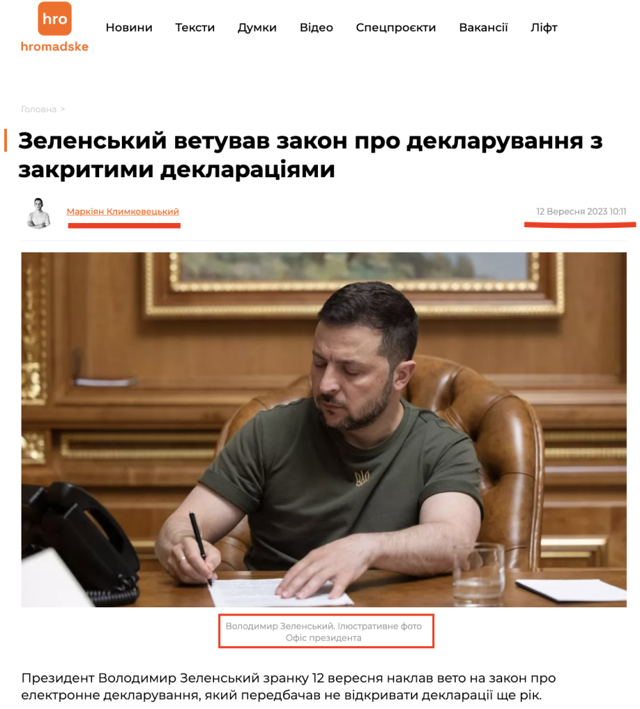 Для перевірки цієї інформації достатньо звернути увагу на використаний скриншот — на ньому зазначено прізвище автора і дата публікації новини. StopFake пошукав новини з такими параметрами і виявив, що для створення фейку було . Переглянувши всі матеріали Маркіяна Климковецького за 12 вересня ми також виявили, що агітпроп переробив для цього фейка — про ветування Зеленським закону про декларування із закритими деклараціями. Час публікації цієї новини такий самий, як і на фейковому скриншоті. Використано ту саму фотографію президента, підпис до неї теж збігається.