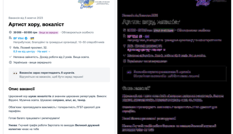 У мережі поширюють скриншот вакансії від Благодійної організації «Вільні», яка начебто шукає на роботу артиста хору чи вокаліста. Майбутній працівник буде проповідувати важливість і толерантність ЛГБТ-ідеології для парафіян.