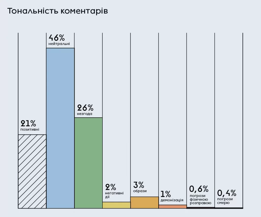 Согласно результатам исследования, анализ искусственным интеллектом тональности комментариев показал, что 21% комментариев выражают поддержку ЛГБТ+ сообществу. А почти половина украинцев и украинок (46%) на самом деле не имеют четкой позиции относительно ЛГБТ+ сообщества.
