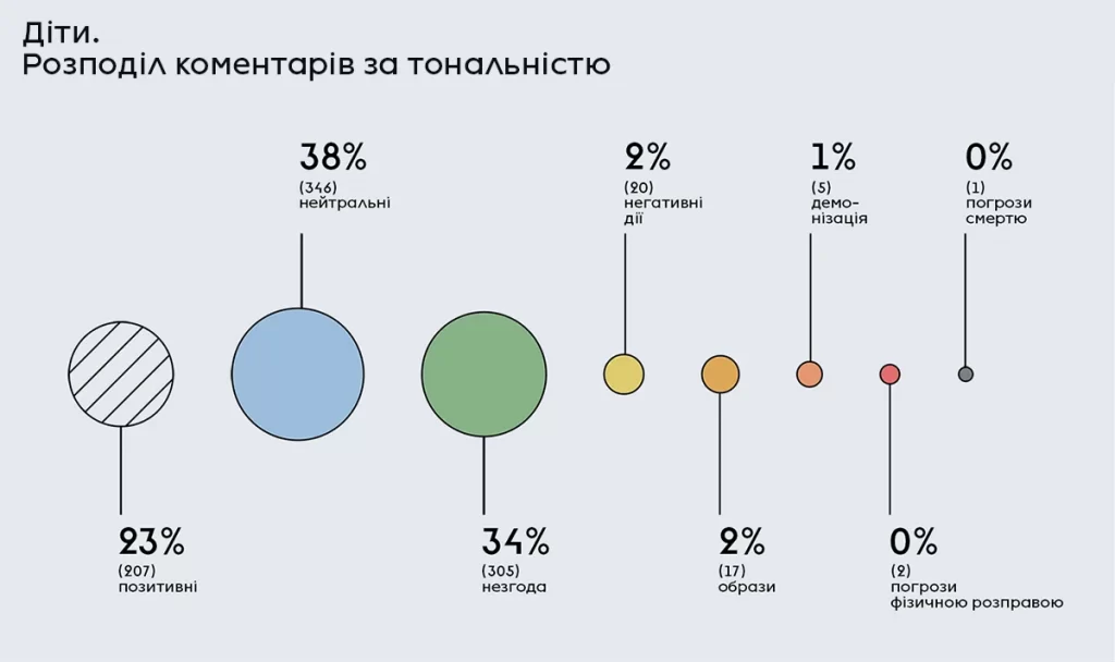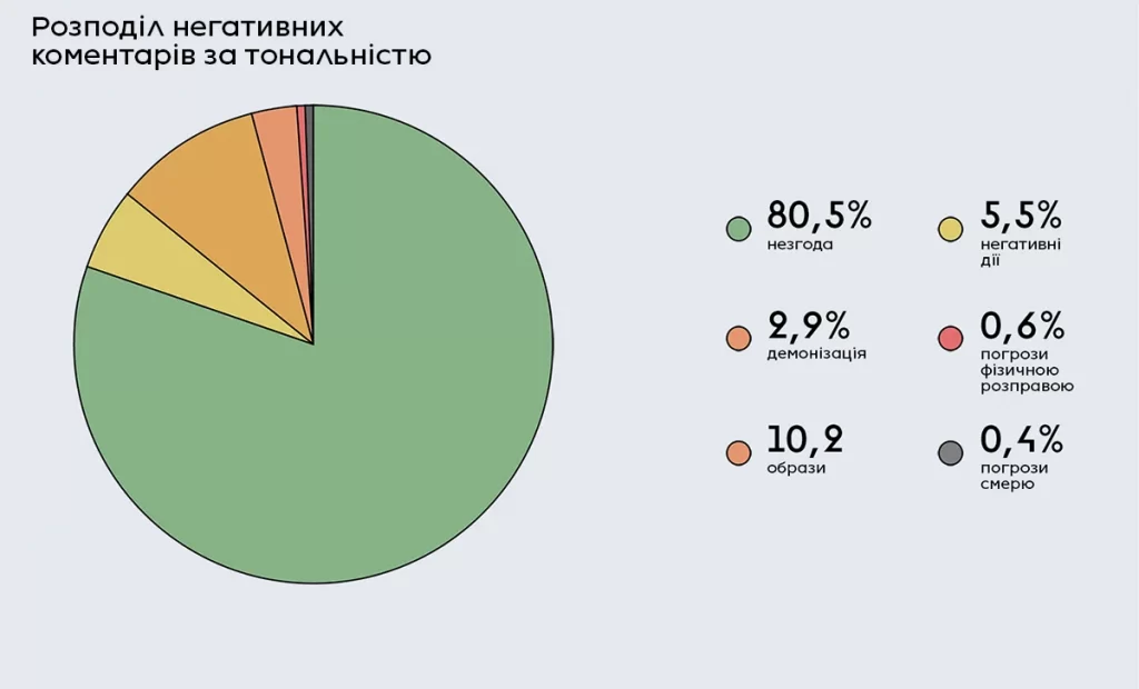 Кроме того, 80% негативных комментариев – это трансляция стереотипов и антинаучных фактов без призывов к насилию. Хотя процент негативных комментариев довольно большой – 33%, значительная их доля – высказывание несогласия. В эту категорию также подпадают комментарии, которые поддерживают стереотипы и отрицают факты, говорится в исследовании.