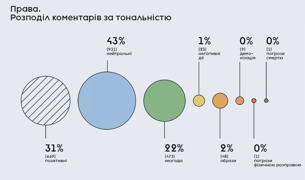 «Наиболее комментируемой темой является тема прав человека. Она вызывает больше всего интереса пользователей и пользовательниц украинского ФБ-сегмента. Здесь мы видим, как дискурс “прав человека” постепенно входит в обиход широких масс в Украине – что именно люди думают о правах человека, с чем их ассоциируют и как мисинтерпретируют правозащитный контекст», – говорится в исследовании.