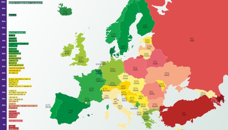 За минулий рік Україна покращила свої показники на 1 пункт, і тепер рівень захисту прав ЛГБТК в нашій країні за оцінкою ІЛГА-Європа дорівнює 20% — це стільки ж, як у Болгарії, та краще, ніж у таких країнах Євросоюзу, як Польща (15%) і Румунія (18%). Найгіршою ситуація для ЛГБТК спільноти, як і в минулому році, є в Азербайджані (2%), Туреччині (4%), росії та Вірменії (по 8%). Так само не змінилася й трійка лідерів: з великим відривом від решти лідирує Мальта (89%), за якою слідують Бельгія та Данія (по 76%). Прихід до влади проєвропейського уряду в Молдові сприяв різкому прогресу нашої сусідки: за рік її показники виросли майже вдвічі, з 21% до 39%.