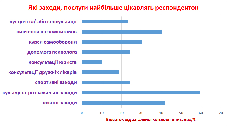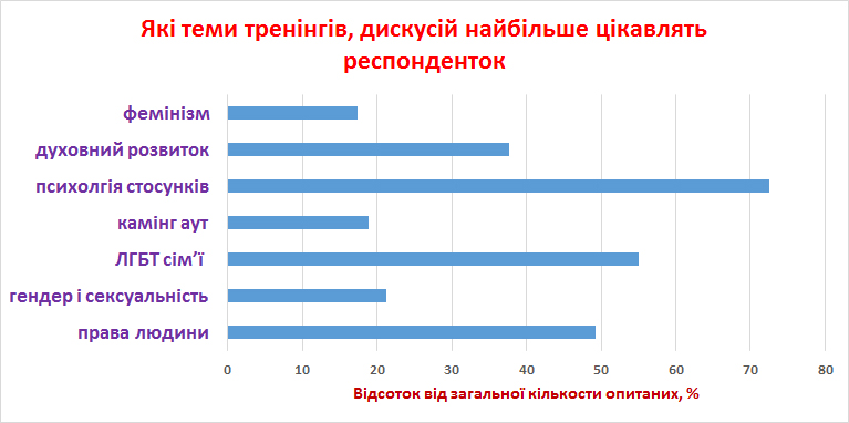 Результаты исследования (см. Иллюстрации) позволяют говорить, что потребность в юридических и психологических сервисах очень высоки. Среди женщин, которые обращались за медицинскими услугами, большинство испытывали трудности из-за недоступности услуг. Перечень основных причин: 1) страх, что визит не будет конфиденциальным; 2) отсутствие специализированного врача, компетентного в вопросах ЛГБТ здоровья; 3) стигма и дискриминация. Опрос также выявил потребность в наращивании активностей развития и образования ЛБ-аудитории путем проведения тренингов, мероприятий, лекций по интересующим их темам. В ходе опроса было задокументировано 3 кейса о дискриминации и нарушения прав на ЛБ-женщин.
