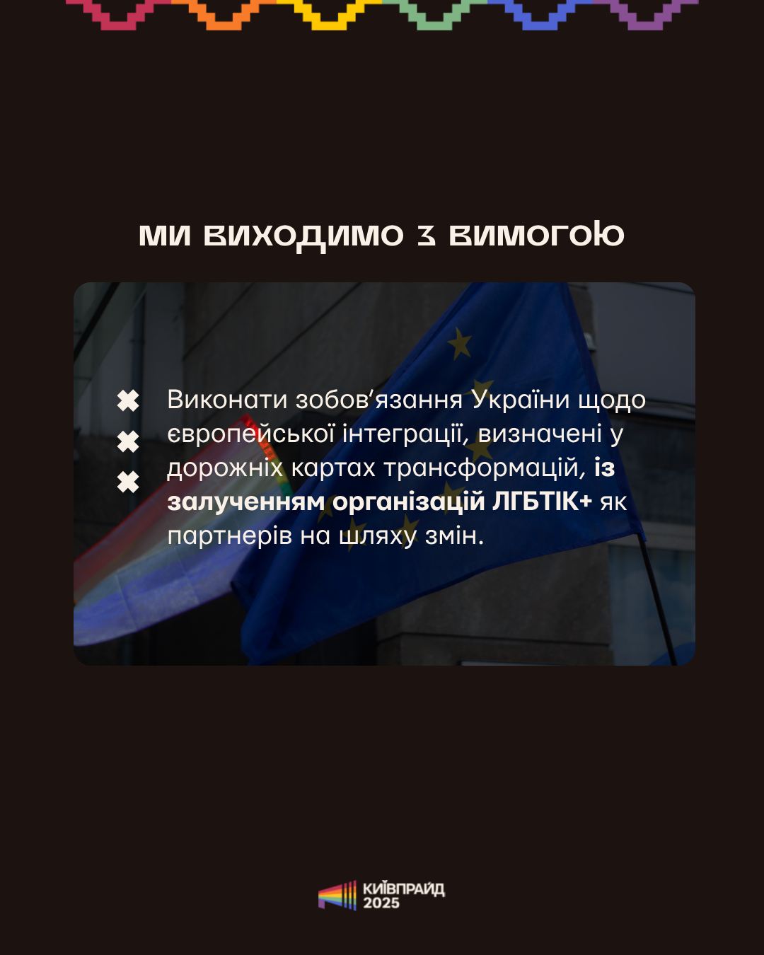 Організатор(к)и КиївПрайду наголошують, що ці вимоги є не лише правозахисною позицією, а й частиною незворотного шляху України до справедливого, демократичного суспільства, де права людини захищені для всіх — без винятків.