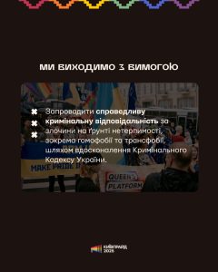 КиївПрайд закликає владу розробити механізми притягнення до відповідальності за мову ворожнечі та заклики до насилля щодо ЛГБТІК+ людей — із дотриманням принципу свободи слова та балансу між свободою та безпекою. - Спростити процедури трансгендерного переходу