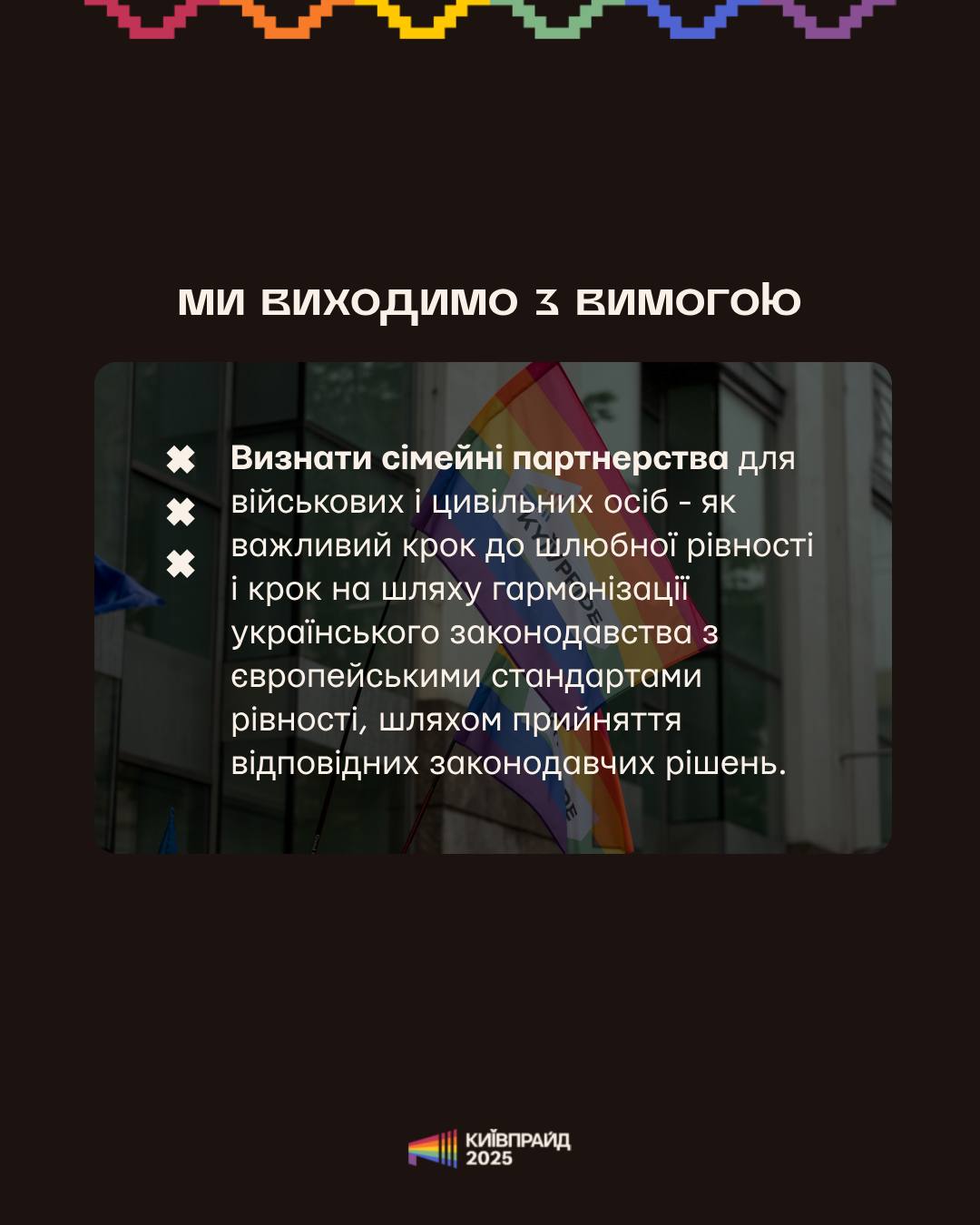 КиївПрайд вимагає прийняття законодавства, яке визнає сімейні партнерства як для військових, так і для цивільних осіб, незалежно від статі. Це — перший крок до запровадження шлюбної рівності та гармонізації українського законодавства з європейськими стандартами. - Виконання зобов’язань щодо євроінтеграції