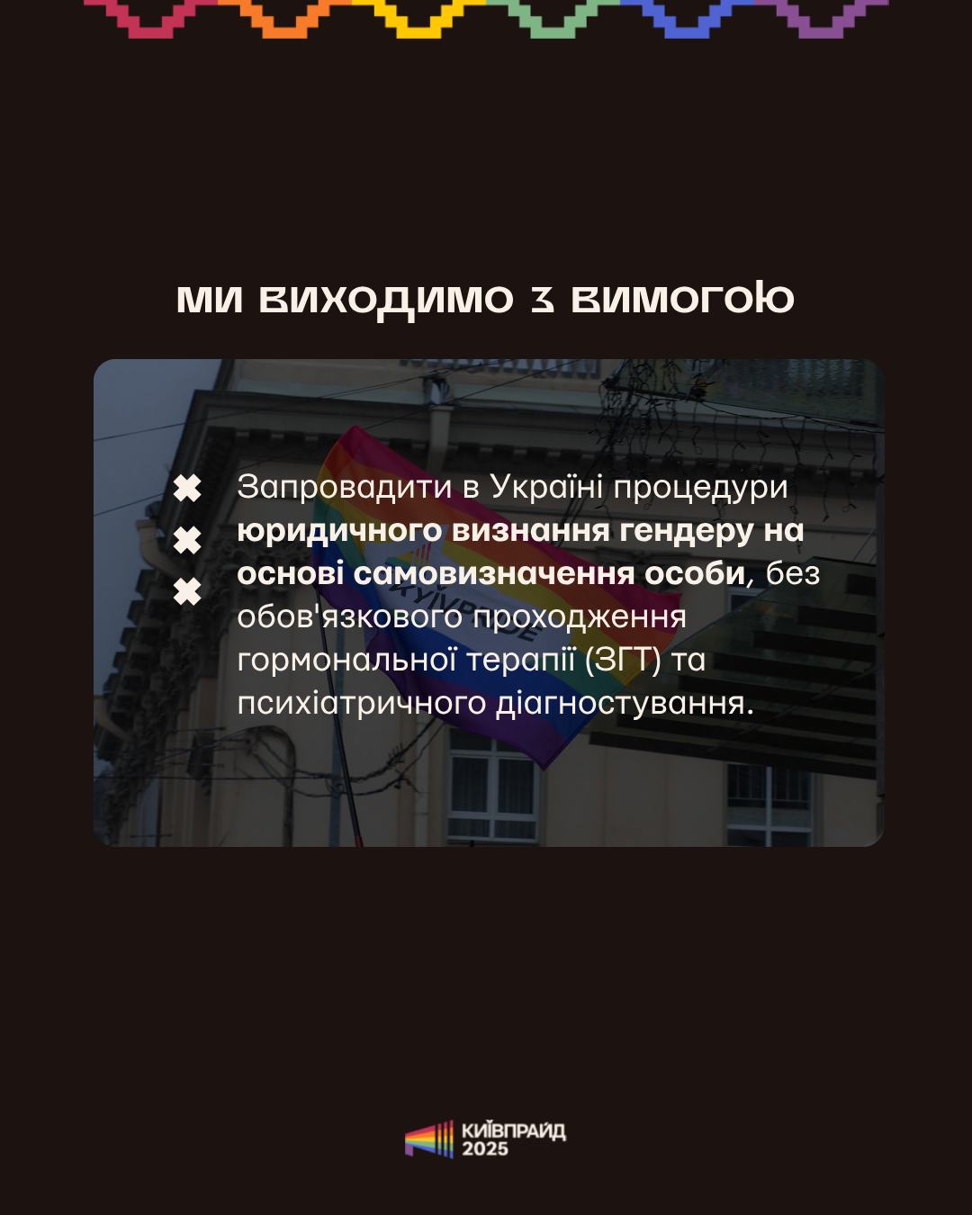 КиївПрайд закликає запровадити процедури зміни гендерного маркера на підставі самовизначення особи — без вимог до проходження гормональної терапії, психіатричного діагнозу або інших медичних втручань.