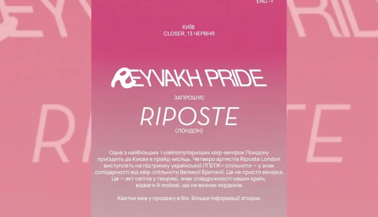 Одна з найвідоміших та наймасштабніших квір-вечірок Лондона, Riposte, вперше завітає до Києва! 13 червня у клубі Closer (вул. Нижньоюрківська, 31) відбудеться особлива подія на підтримку української ЛГБТК+ спільноти.