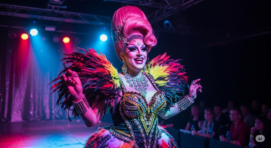 - Drag queens — артисти/-ки, які створюють гіперболізований жіночий образ. Часто це яскравий макіяж, перуки, костюми та сценічний перформанс.