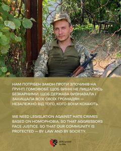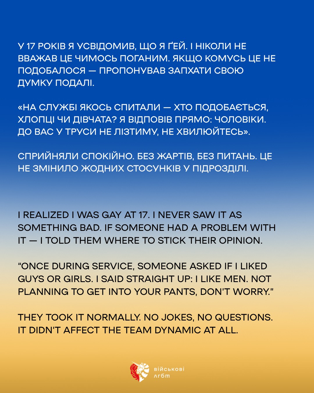 «Моя орієнтація нічого не змінила. Побратими залишилися зі мною, як і були. У війську головне — чи можеш ти прикрити спину, а не з ким ти спиш».