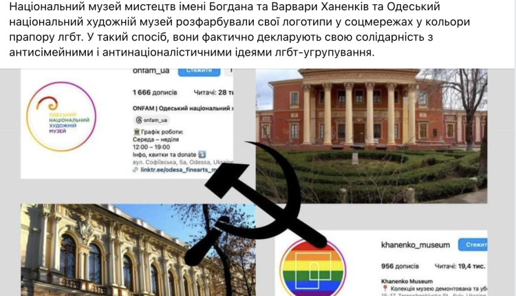 «Національний музей мистецтв імені Богдана та Варвари Ханенків та Одеський національний художній музей розфарбували свої логотипи у соцмережах у кольори прапору лгбт. У такий спосіб, вони фактично декларують свою солідарність з антисімейними і антинаціоналістичними ідеями лгбт-угрупування», — йдеться у дописі Нацспілки письменників.