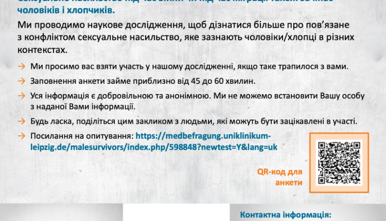 На кафедрі медичної психології та медичної соціології Лейпцизького університету наразі проводиться опитування, метою якого є дослідження різних форм і психосоціальних наслідків сексуального насильства щодо чоловіків, зумовленого військовими діями.
