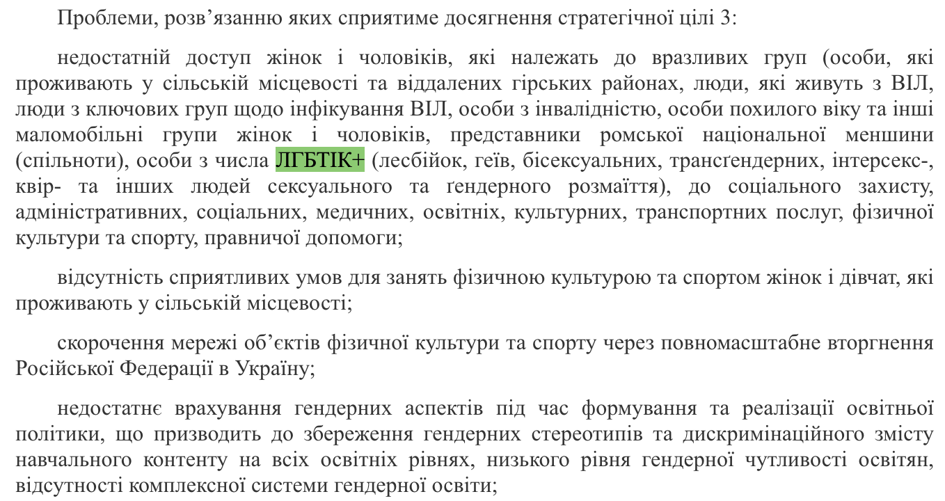 У тексті Стратегії, затвердженої розпорядженням Кабінету Міністрів України, згадується “недостатній доступ” до низки послуг для жінок і чоловіків, які належать до вразливих груп, серед яких окремо перелічені “особи з числа ЛГБТІК+ (лесбійок, геїв, бісексуальних, трансґендерних, інтерсекс-, квір- та інших людей сексуального та ґендерного розмаїття)“. Це стосується доступу до соціального захисту, адміністративних, соціальних, медичних, освітніх, культурних, транспортних послуг, фізичної культури та спорту, а також правничої допомоги.