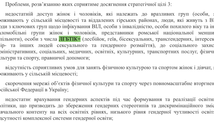 У тексті Стратегії, затвердженої розпорядженням Кабінету Міністрів України, згадується “недостатній доступ” до низки послуг для жінок і чоловіків, які належать до вразливих груп, серед яких окремо перелічені “особи з числа ЛГБТІК+ (лесбійок, геїв, бісексуальних, трансґендерних, інтерсекс-, квір- та інших людей сексуального та ґендерного розмаїття)“. Це стосується доступу до соціального захисту, адміністративних, соціальних, медичних, освітніх, культурних, транспортних послуг, фізичної культури та спорту, а також правничої допомоги.