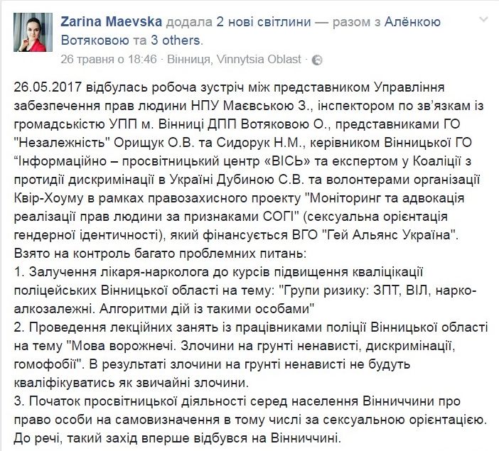 «Полицейские Винницкой области пройдут курсы повышения квалификации при участии врача-нарколога на тему „Группы риска: ЗПТ, ВИЧ, нарко-алкоголики. Алгоритмы действий с такими лицами“. Кроме того, работники полиции прослушают лекции на тему „Язык вражды. Преступления на почве ненависти, дискриминации, гомофобии“», — написала после мероприятия в Facebook Зарина Маевская.