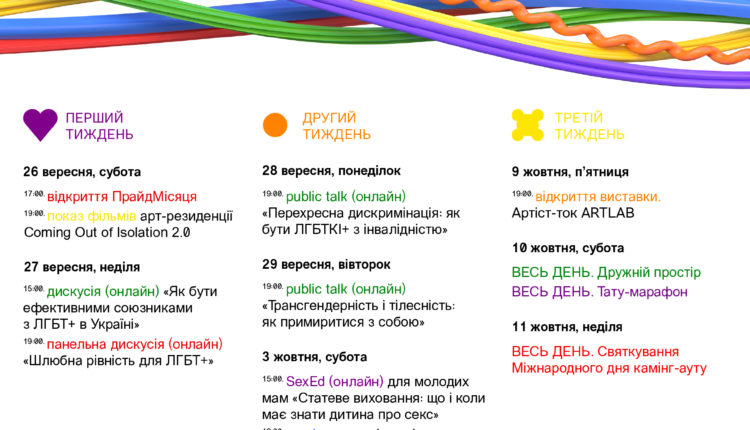 С 26 сентября по 11 октября в Киеве состоится ПрайдМесяц – серия культурно-просветительских мероприятий, посвященных правам человека для ЛГБТ + сообщества, сообщают организаторы.