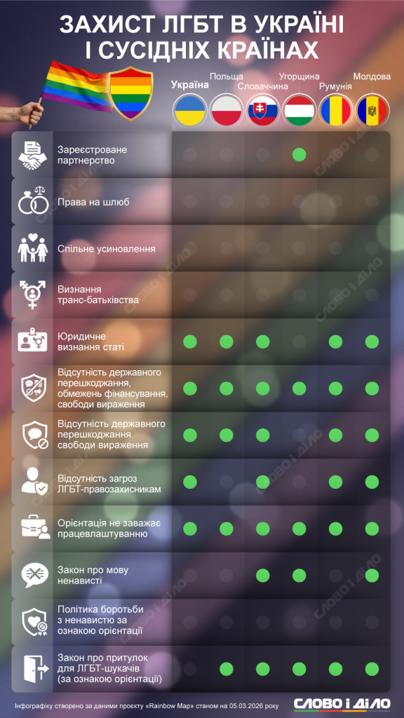 Дослідники також зазначають, що в Україні, Польщі, Словаччині, Румунії та Молдові на державному рівні не встановлено обмежень для діяльності ЛГБТ-організацій, не зафіксовано перешкод у фінансуванні чи свободі висловлювання.