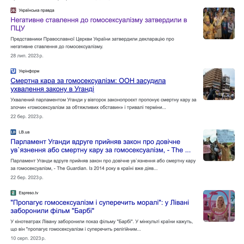 *Моніторинг проводився з 1 до 30 листопада 2023 року включно автоматизованими методами збору згадок про ЛГБТ+. Зафіксовано 112 матеріалів на цю тему. До вибірки моніторингу потрапили 20 популярних онлайн-медіа за результатами квартального звіту Similarweb: ТСН, “Українська правда”, NV, Цензор.Нет, РБК-Україна, “24 канал”, Liga.net, “Еспресо”, “Гордон”, “Фокус”, “Кореспондент.net”, УНІАН, Obozrevatel, Zaxid.net, Delo.ua, “Телеграф”, Новини.Live, “Апостроф”, “Інформатор”, Суспільне.