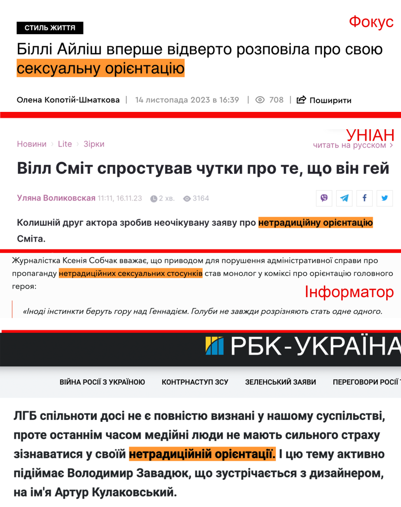 Щодо вживання терміна “гомосексуалізм”, то цю тенденцію ІМІ помітив ще 2021 року. Тоді ми , що медіа використовують хештег зі словом “гомосексуалізм”. Як повідомляв ІМІ, використання лексем із суфіксом -ізм вказує на хворобу. Наразі фіксуємо, що медіа “Фокус” досі ним . На онлайн-ресурсі “Без бар’єрів” , що “суфікс -ізм несе ідеологічний відтінок і використовується на позначення якихось течій та ідеологій, а гомосексуальність – це не є ідеологія, це природа людини від народження. Крім того, суфікс -ізм несе негативний відтінок з тих часів, коли гомосексуальність вважали хворобою. Проте ще в 1990 році Всесвітня організація охорони здоров’я виключила гомосексуальність із міжнародного переліку захворювань, тим самим затвердивши, що гомосексуальна орієнтація є нормою”.