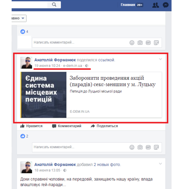 Кроме того, сотрудник полиции опубликовал ссылку на указанную петицию на своей в Facebook. Он также написал пост, в котором осудил проведение Марша равенства в Киеве, однако позднее удалил сообщение.