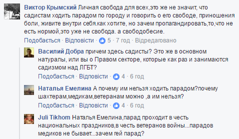 “Личная свобода для всех, это же не значит, что садистам ходить парадом по городу и говорить о его свободе, приношения боли, живите внутри себя, как хотите, но зачем пропагандировать то, что не есть нормой. Это уже не свобода, а свободобесие”, – написал Виктор Крымский.