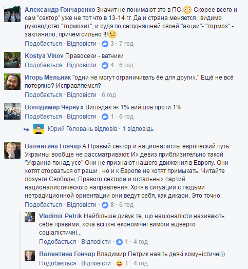 “А “Правый сектор” и националисты европейский путь Украины вообще не рассматривают. Они не признают нашего движения в Европу. Они хотят оторваться от Раши, но и к Европе не хотят примыкать. Читайте лозунги “Свободы”, ” Правого сектора” и остальных партий националистического направления. Хотя в ситуации с людьми нетрадиционной ориентации они ведут себя, как дикари. Это точно”, – подчеркнула Валентина Гончар.