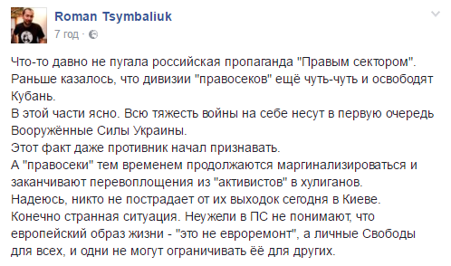 “А “правосеки” тем временем продолжаются маргинализироваться и заканчивают перевоплощения из “активистов” в хулиганов”,- написал журналист.