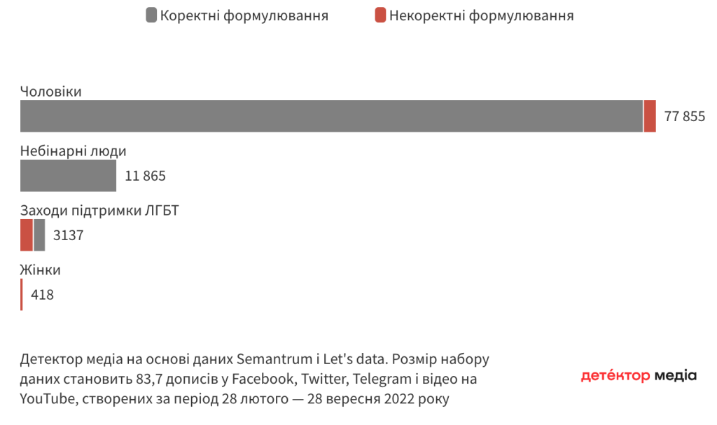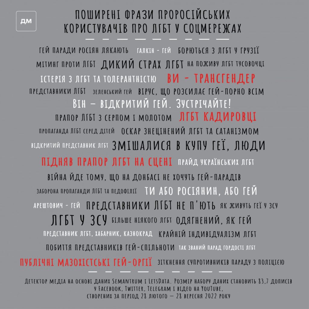 «Детектор медіа» в умовах великої війни системно досліджує російську дезінформацію в українському та російському сегментах соцмереж і помітив зростання кількості згадок та маніпуляцій на темах, які стосуються життя ЛГБТ-людей (лесбійок, геїв, бісексуалів та бісексулок, трансгендерних людей, інтерсекс-людей тощо). Йдеться і про маніпуляції щодо служби ЛГБТ-людей в українській армії, і про твердження, що Україна приречена на поразку, адже нею керують гомосексуали, тощо. «Детектор медіа» проаналізував український та російський сегменти соціальних мереж, щоб з’ясувати, в якому контексті проросійські користувачі згадували ЛГБТ-людей та які меседжі про них найчастіше поширювали.