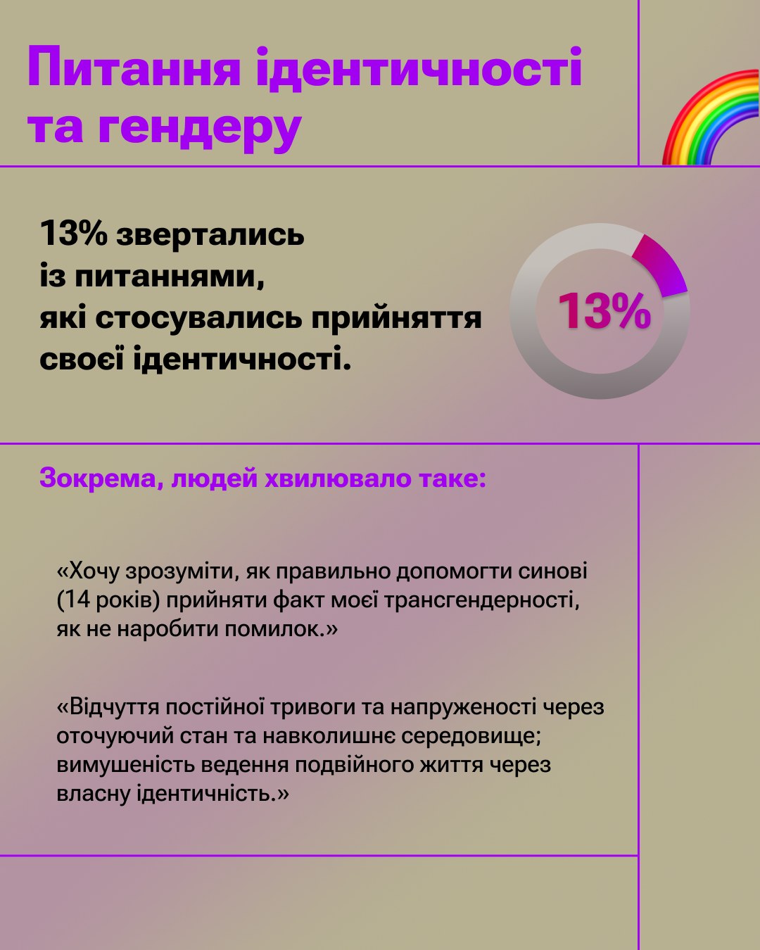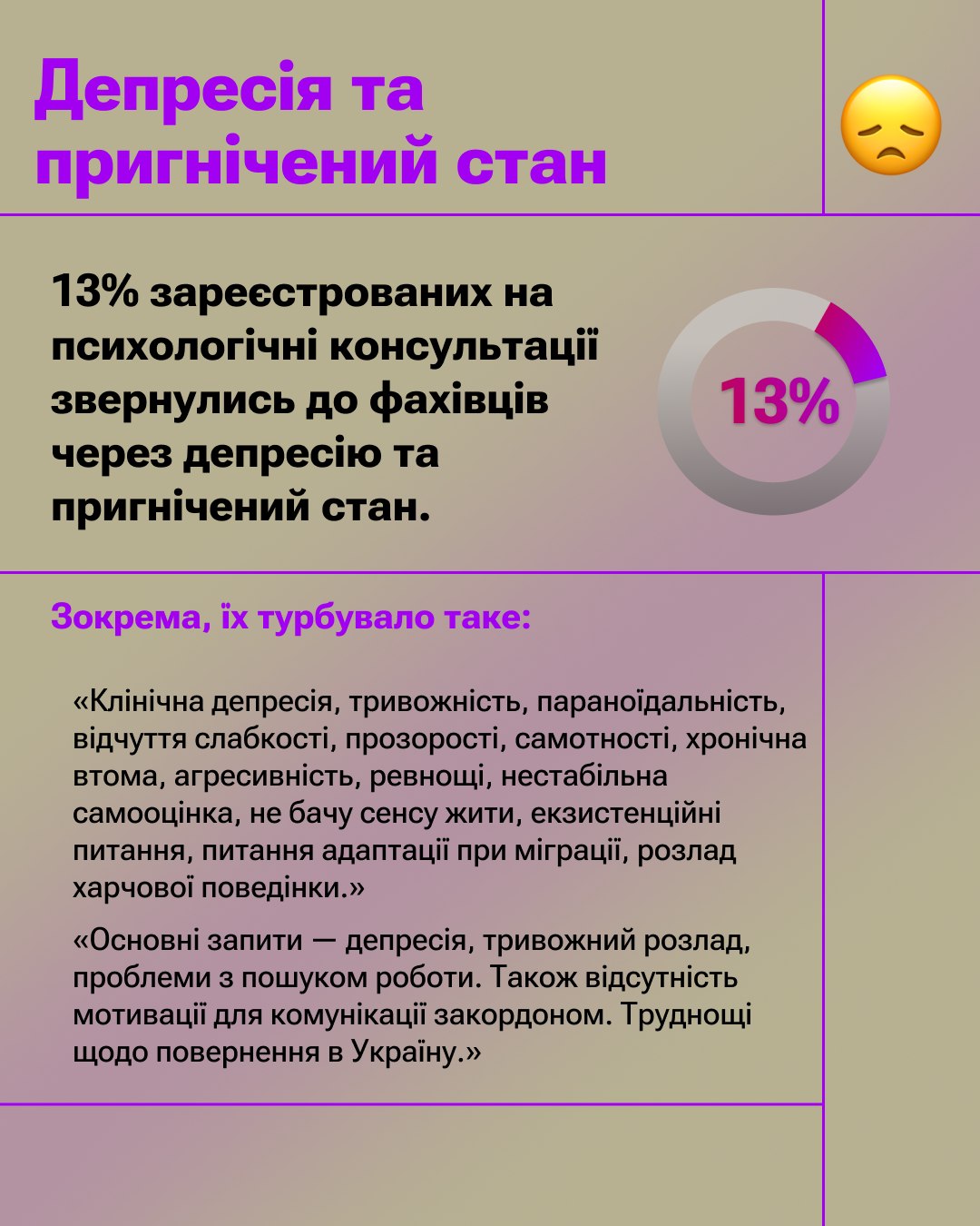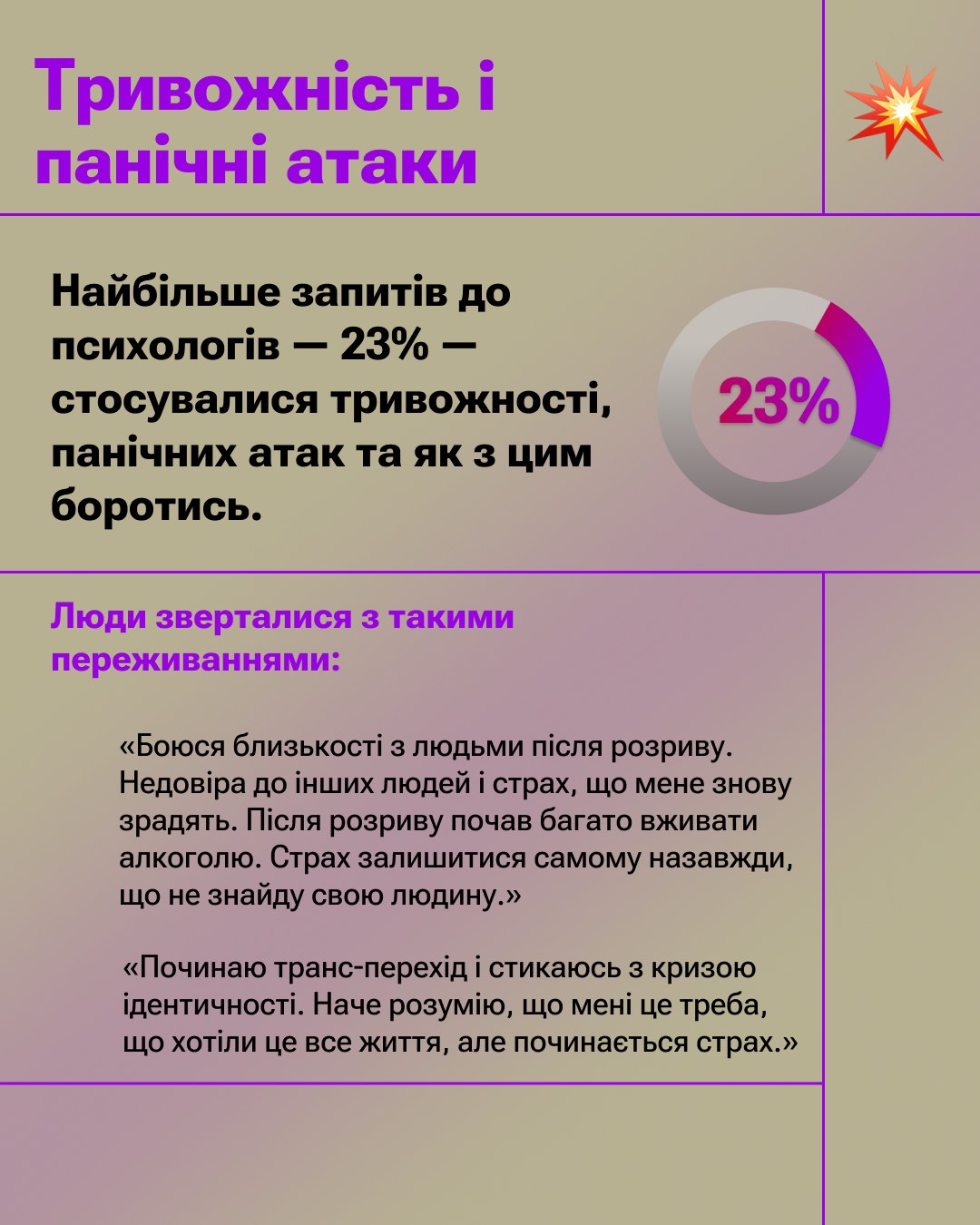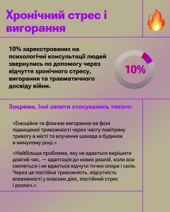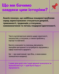 Аналіз запитів, з якими звертались до наших дружніх психологів та психологинь, показав, що найбільше людей турбує тривожність, депресія, пригнічений стан, прийняття своєї ідентичності та травматичний досвід війни. Також люди говорили про відчуття самотності, насильство у стосунках та про виклики в кар’єрі та навчанні. І, що дуже показово, багато хто стикається з емоційним вигоранням і відчуває потребу в підтримці.