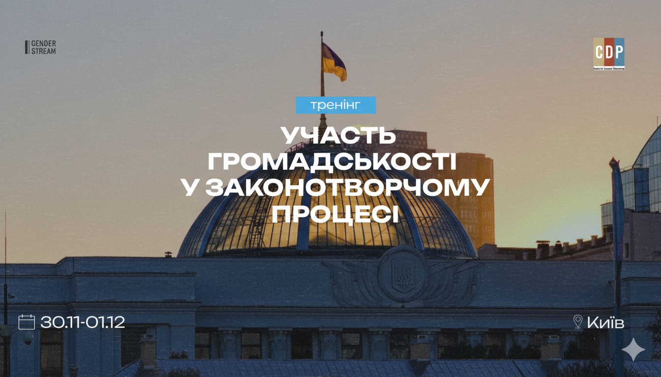 Громадська організація Gender Stream запрошує на дводенний тренінг «Участь громадськості у законотворчому процесі», який відбудеться 30 листопада – 1 грудня у Києві.