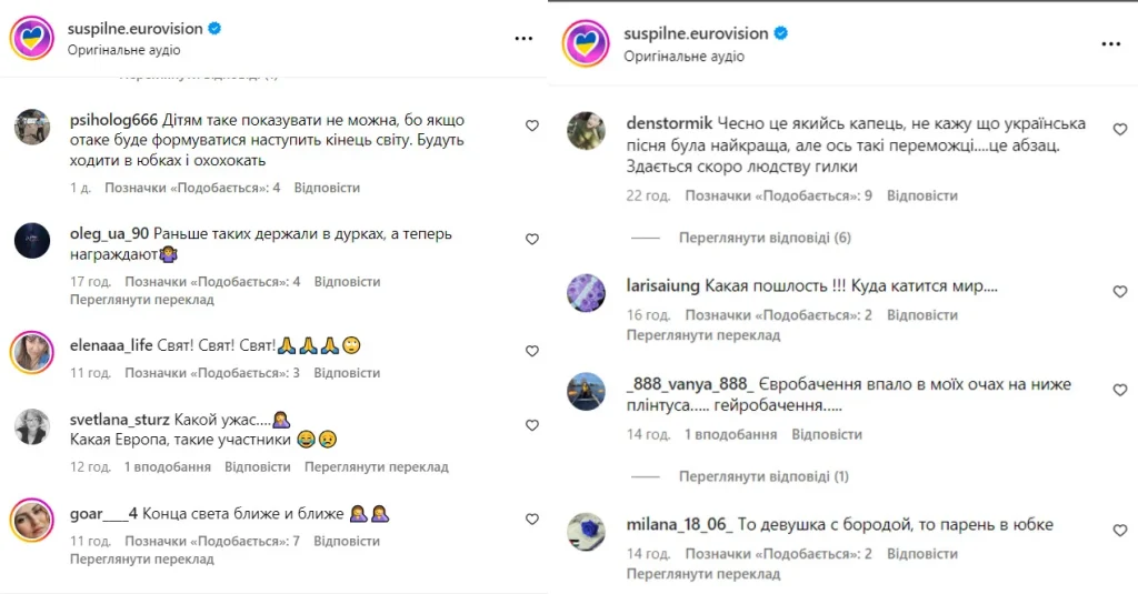 Що цікаво, сторінку того ж “Суспільне Євробачення” в Instagram “атакували” користувачі з росії. Країна-агресор не бере участь в конкурсі з 2022 року. Але громадяни цієї країни “підглядають” за “Євробаченням”. Після перемоги Nemo вони написали безліч коментарів в стилі “Слава Богу, що нас не має на цьому балі богохульства”. В цілому, це було схоже на пук у відкритому космосі.